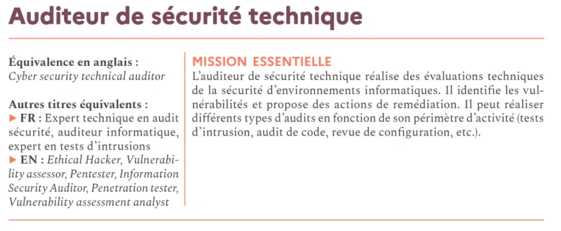 Voici, par exemple, la description courte du métier d’auditeur de sécurité technique dans le document "Panorama des métiers de la cybersécurité de l’ANSSI" :