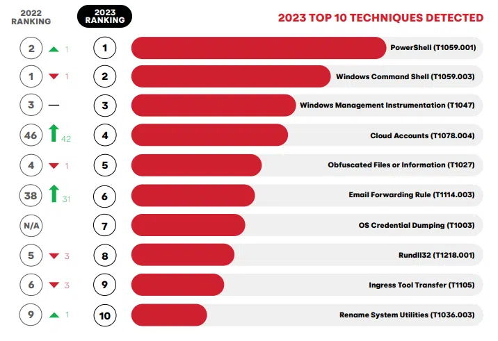 Il est à noter la montée fulgurante du TTP Cloud Account, qui passe de la 46ᵉ place en 2022 à la 4ᵉ aujourd'hui. Cette technique (T1078.004 - Cloud Accounts) vise à utiliser des identifiants volés d'environnement Cloud pour réaliser un premier accès à une cible, mais aussi de la persistance, de l'élévation de privilège ou de l'évasion de défense.