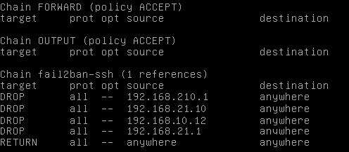 On voit donc plusieurs IP dans la chaine "fail2ban-ssh" qui est le nom par défaut de la chaine où sont indiquées l'état et les IP bannies. On repère donc la ligne sur laquelle se trouve notre IP (par exemple la ligne 2 pour l'IP "192.168.21.10" puis ont la dé-banne avec la ligne suivante :