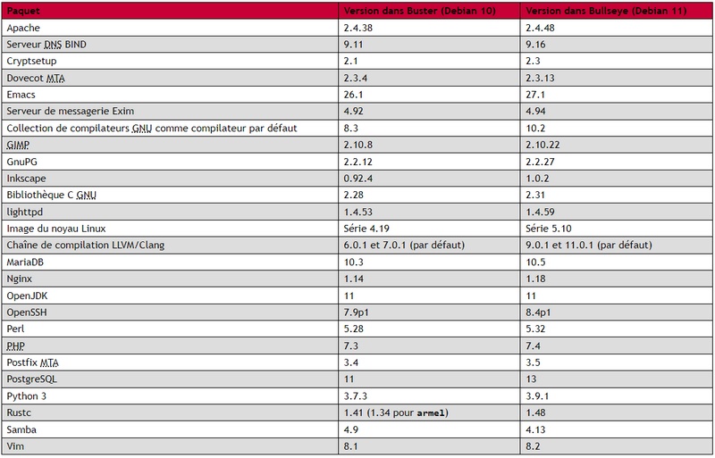 Au sein de la documentation de Debian, il y a d'ailleurs un tableau qui montre les changements de versions opérés entre Debian 10 et Debian 11, pour certains paquets :