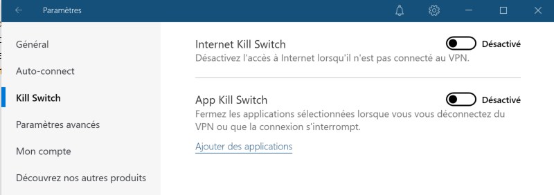 ➡ Fonction "kill switch" automatique : cette fonctionnalité permet de couper votre connexion à Internet immédiatement si le VPN se déconnecte. Par exemple, si vous êtes connecté à un réseau public et que la connexion VPN est perdue, ceci évite que votre trafic réseau passe sur le réseau public sans être protégé par le VPN.