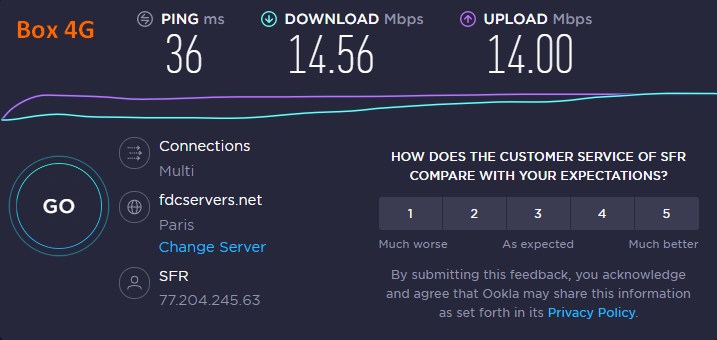 Les résultats sont vraiment bons : en fait, on ne voit pas la différence, qu'il y ait ou non le VPN actif. Lorsqu'il est connecté aux Etats-Unis, le débit reste le même, il y a seulement une latence supérieure (ping), mais acceptable. D'autant plus qu'à la maison j'utilise une box 4G et que le débit est variable et le ping aussi.