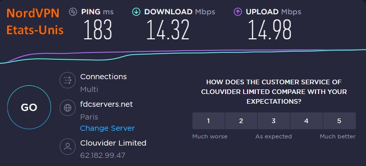 Voyons maintenant ce que donne un test de débit, sans et avec le VPN (France et Etats-Unis) :