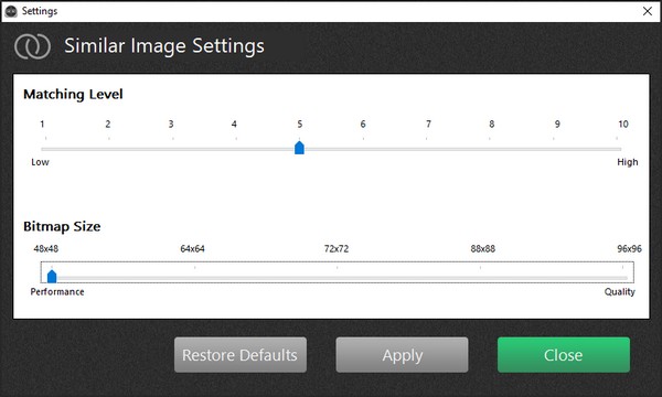 Lorsque l'on utilise ce mode, on peut ajuster le seuil de "matching" pour trouver les images similaires.