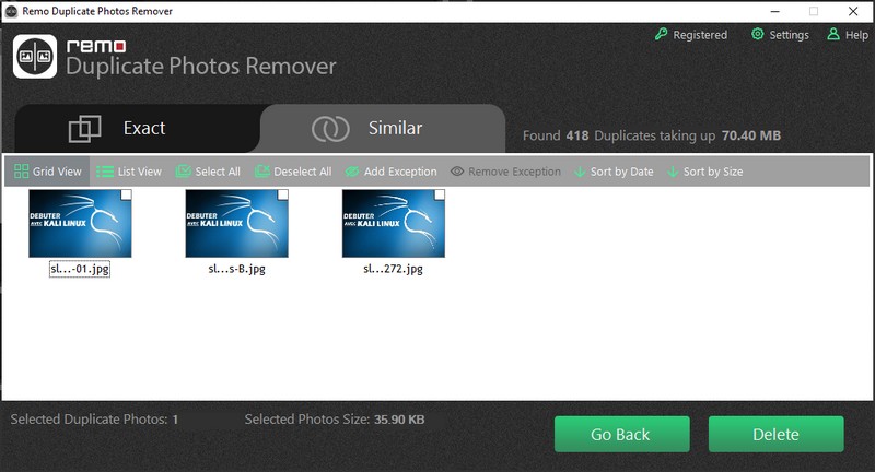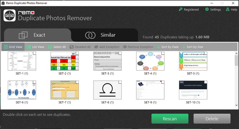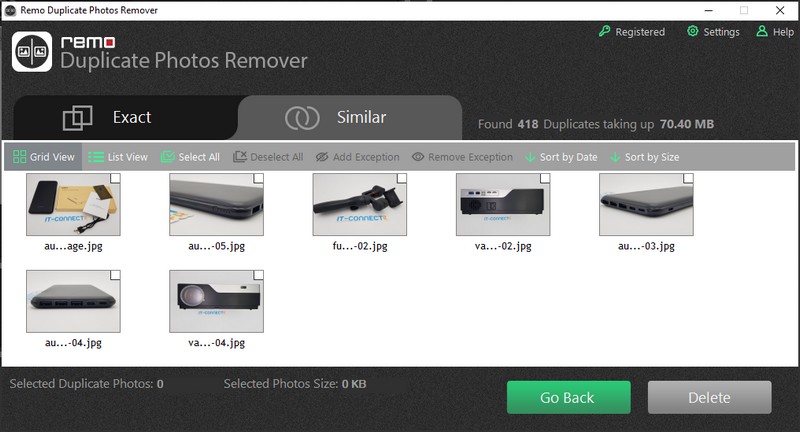 Le bouton "Add exception" sert à poser une exception sur les photos sélectionnées afin de ne pas tenir compte de ce doublon lors des prochaines analyses. Cela sera utile si vous souhaitez conserver plusieurs fois le même fichier, sans risquer de la supprimer.
