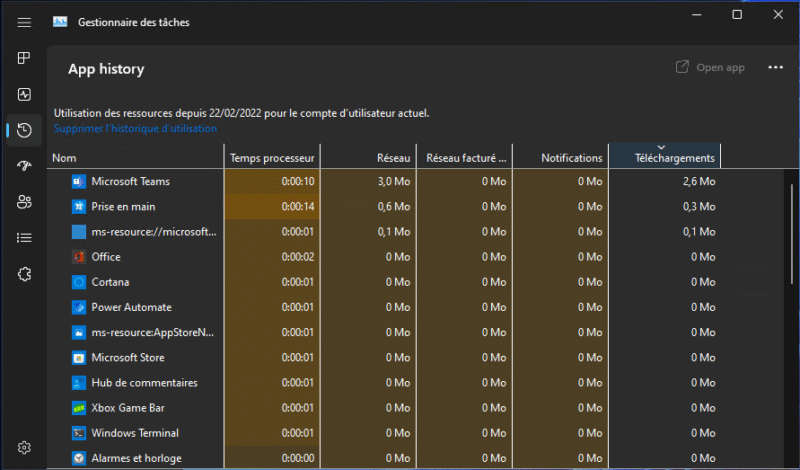 Personnellement, je n'utilise pas l'historique des applications et d'ailleurs j'ai profité de ce nouveau Gestionnaire des tâches pour redécouvrir cette fonctionnalité. Elle permet d'avoir une liste des applications puis de savoir quelles sont les applications qui utilisent le plus le processeur et le réseau.
