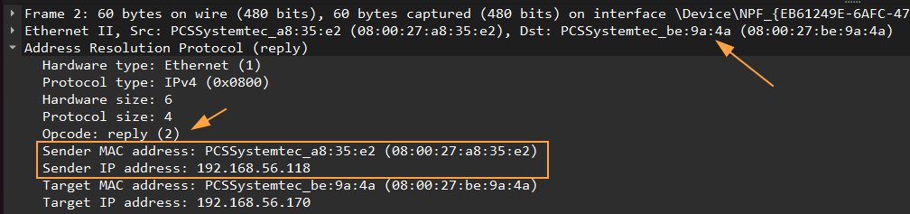 Nous voyons ici l’opcode à 2 (reply) ainsi que les adresses MAC et IP de l’hôte B. Ce paquet cible alors l’hôte A.