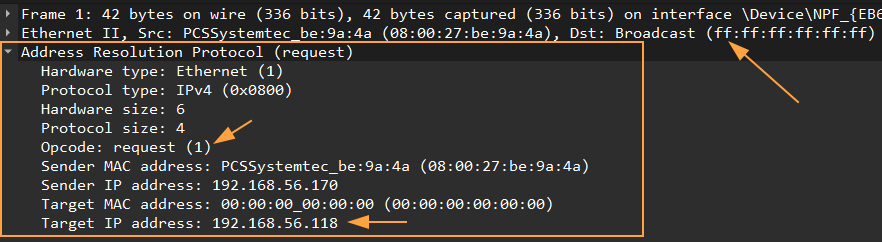 C’est cet échange que nous allons analyser. Constatant qu’il ne connait pas l’adresse MAC liée à l’adresse IP qu’il souhaite atteindre (192.168.56.118), mon système décide de poser la question à ses voisins du réseau local.