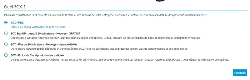 Puis, vous devez choisir quelle version de 3CX vous souhaitez utiliser. Ici, ce sera la version gratuite donc "3CX FREE". Ceci ne vous empêche pas de passer sur une version payante par la suite.