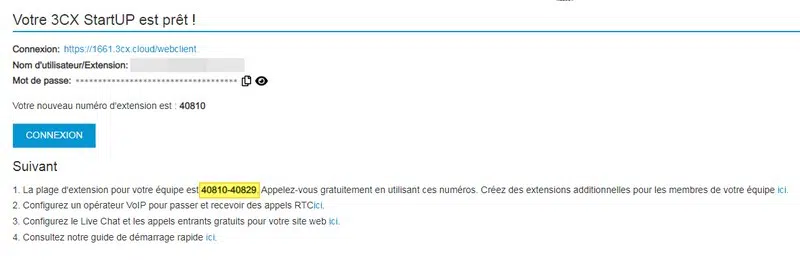Une fois que la création de l'environnement est terminée, 3CX vous indique l'URL de connexion à votre instance ! Il y a également une autre information très importante, c'est le numéro d'extension ainsi que la plage d'extension pour les futurs utilisateurs. En fait, ceci correspond aux numéros internes que vous pouvez utiliser pour vous appeler entre utilisateurs d'une même organisation.