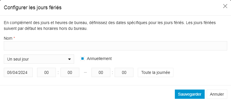 La fonction "Jours fériés du bureau" s'avère très utile pour déclarer toutes les fermetures exceptionnelles, que ce soit pour un jour férié ou pour une autre raison.