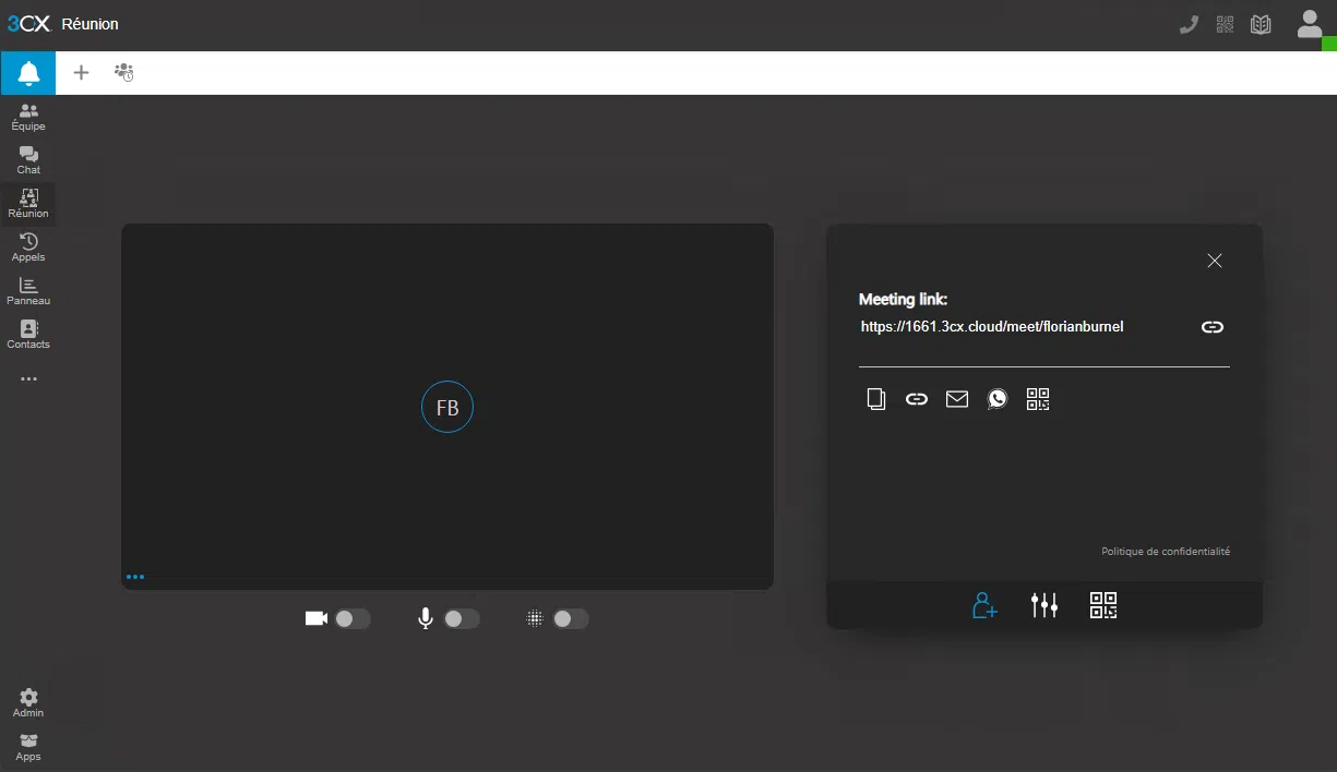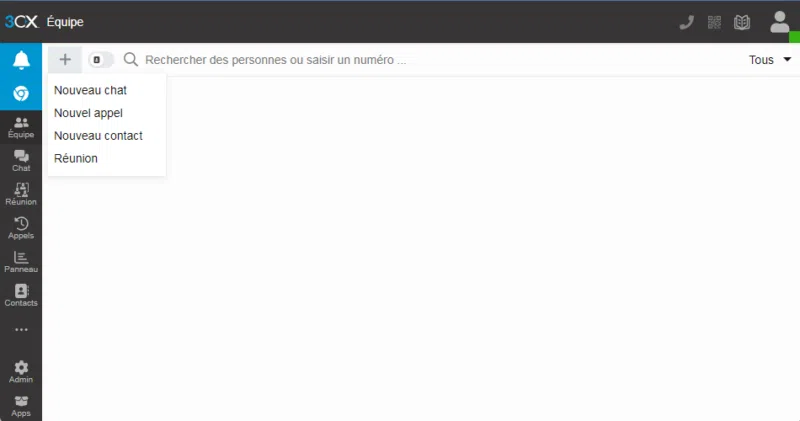 Voilà, bienvenue sur l'interface d'administration de 3CX ! Celle-ci regroupe plusieurs sections : équipe, chat, réunion, appels, panneau, contacts, messagerie vocale et paramètres (de votre compte). En complément, un bouton "Admin" est accessible dans le bas de la liste et il est visible uniquement pour les utilisateurs qui ont les droits.