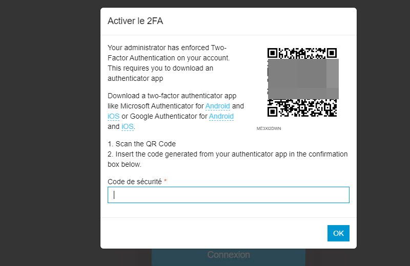 Puis, après avoir défini le mot de passe, l'utilisateur doit configurer l'authentification à deux facteurs à partir d'une application comme Microsoft Authentification, FreeOTP, etc.