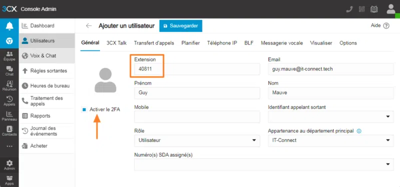 Nous devons compléter la fiche de l'utilisateur avec son nom, son prénom, son e-mail, etc... Et lui associer un numéro d'extension (si celui proposé par 3CX ne convient pas). Cet utilisateur aura aussi un rôle qui définit son niveau de permission (Utilisateur ; Réceptionniste ; Administrateur du département ; Manager ; Propriétaire). Par ailleurs, la version 20 de 3CX ajoute la prise en charge du 2FA : c'est une bonne nouvelle, car lors de la première connexion, l'utilisateur devra configurer le 2FA.