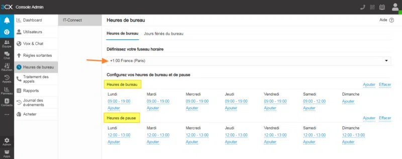L'interface d'administration de 3CX intègre une gestion complète des heures de bureau, des heures de pause, et des jours fériés. C'est l'occasion d'indiquer les heures d'ouverture et de fermeture de votre société, ce qui est important dans le processus de gestion des communications, notamment les appels.