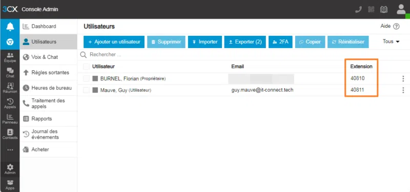 3CX est une solution de communication, donc pour en tirer profit et exploiter tout son potentiel, nous devons créer au moins un second utilisateur. La console d'administration permet de créer un nouvel utilisateur manuellement, ou d'importer une liste à partir d'un fichier CSV.