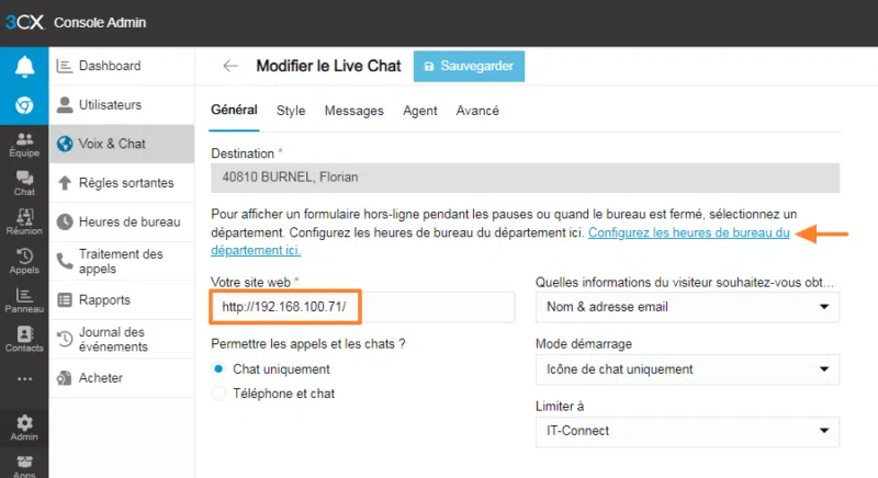 Ces horaires et ces jours fériés vont directement influencer d'autres fonctionnalités de 3CX et déterminer comment les appels seront traités (renvois, transferts, messagerie vocale, etc.). Ceci va aussi jouer sur le statut des utilisateurs : le statut "Absent" pourra être associé à un utilisateur, de façon automatique, en dehors des heures de bureau. Il y a aussi un impact sur la fonctionnalité Live Chat que nous allons découvrir maintenant.