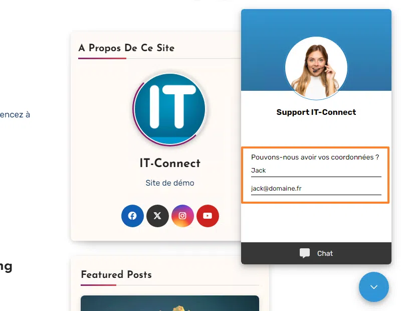 Nous pouvons modifier les paramètres pour demander à l'internaute de préciser son nom et son adresse e-mail. Ainsi, un formulaire est présenté à l'utilisateur avant qu'il puisse commencer à communiquer via le Live Chat :