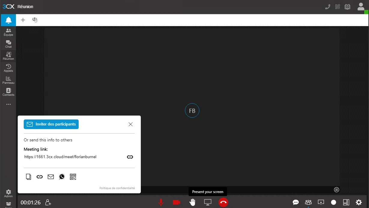 Comme évoqué précédemment, vous pouvez aussi créer une nouvelle réunion en visio. Il peut s'agir d'une réunion avec des utilisateurs 3CX, mais aussi des invités externes. Nous retrouvons les fonctions habituelles, comme la possibilité de flouter l'arrière-plan, de partager un lien vers la réunion, de partager l'écran, de chater, d'enregistrer la réunion ou encore de partager un document. Même si cette fonctionnalité reste en retrait vis-à-vis de Microsoft Teams, c'est complet et surtout ce sont des fonctions gratuites.