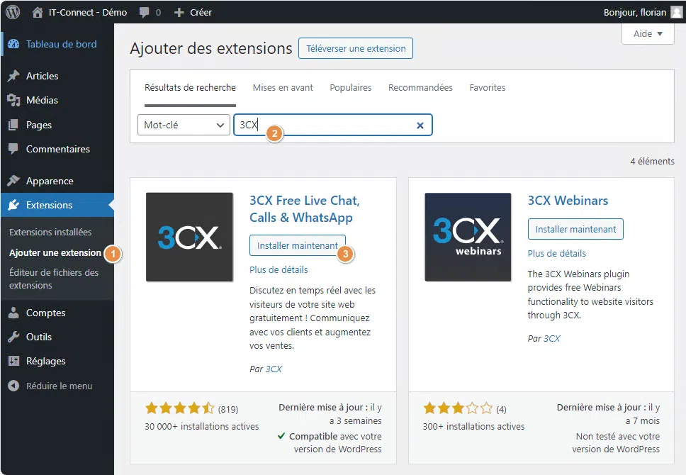 Ici, un site de démonstration sous WordPress sera utilisé. La première étape consiste à installer l'extension officielle "3CX Free Live Chat" sur notre site WordPress. L'application est maintenue par 3CX directement.
