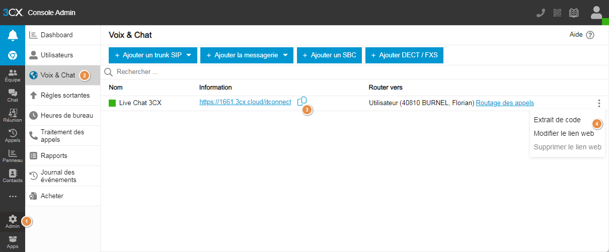 Une fois que l'extension est installée, nous devons basculer sur le portail 3CX pour récupérer le lien vers notre Live Chat 3CX.