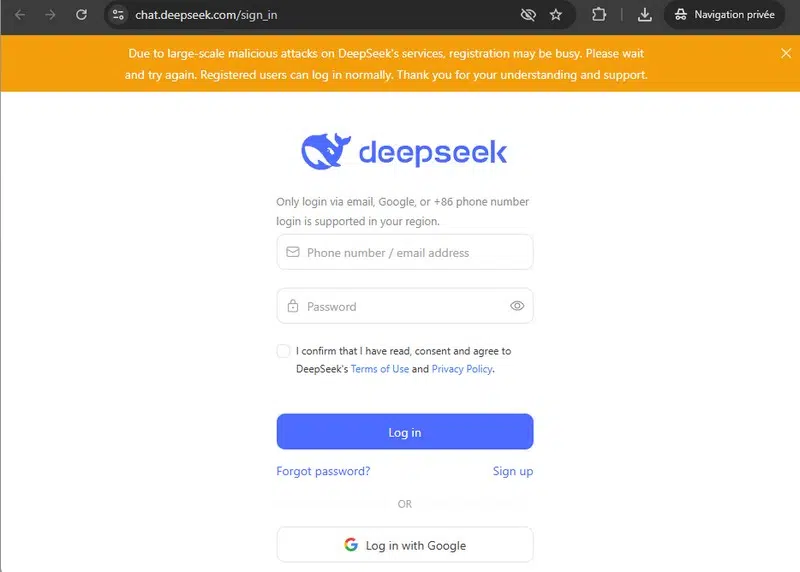 En raison d’attaques informatiques ciblées, DeepSeek a pris la décision de suspendre temporairement les inscriptions. À l'heure actuelle, un bandeau d'avertissement est d'ailleurs toujours visible sur la page d'inscription.