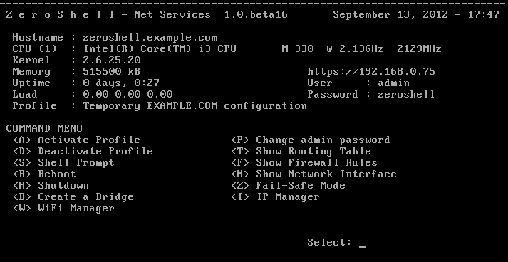 Dès lors nous avons plusieurs informations sur la configuration matérielle de notre Zeroshell, sur son IP (par défaut 192.162.0.75).