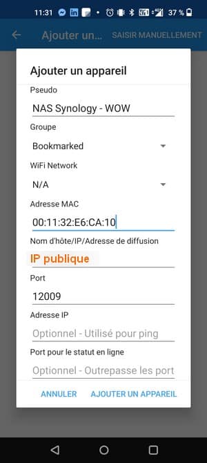 Ensuite, pour tester, vous pouvez installer une application Wake on LAN sur votre smartphone et vous mettre en connexion mobile (4G / 5G). Personnellement, j'utilise cette application. Dans cette application, il faut ajouter une nouvelle machine en précisant l'adresse MAC du NAS, l'adresse IP publique de la Box, ainsi que le numéro de port externe (9 ou 12009 ou autre chose selon la règle de NAT). Si vous avez l'option "Proxy WOL", utilisez le port 9 dans l'application.