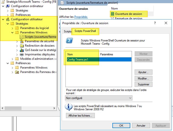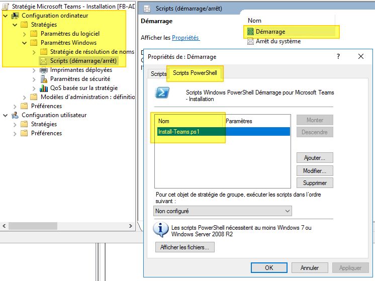 Pour votre GPO, créez un script "Install-Teams.ps1" (par exemple) et ajoutez la ligne ci-dessous (à minima). Configurez la GPO afin qu'elle exécute le script au démarrage du PC, voici comment procéder : Configuration ordinateur > Paramètres Windows > Scripts > Démarrage > Onglet "Scripts PowerShell.