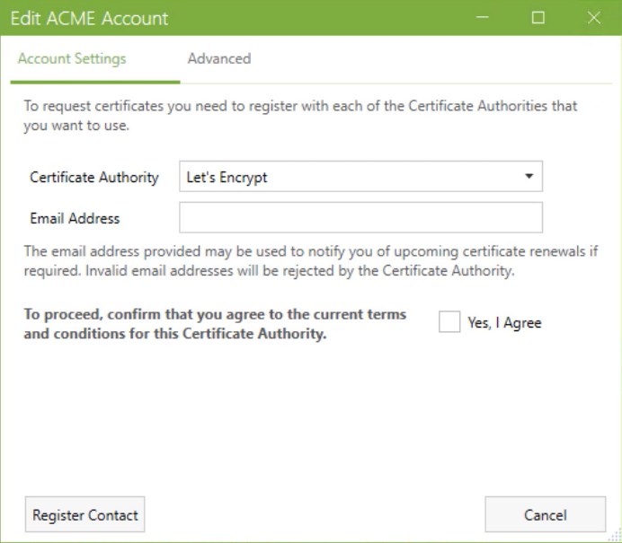 Choisissez "Let's Encrypt" pour "Certificate Authority" et cochez la case "Yes, I Agree". Validez via le bouton "Register Contact"
