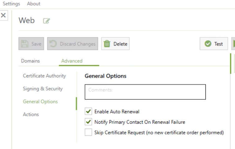 Dans la section "Advanced" puis "General Options", il y a l'option "Enable Auto Renewal" qui est activée par défaut. Cette option permet d'activer le renouvellement automatique du certificat. Plus précisément, tous les 30 jours, le certificat une tentative de renouvellement sera exécutée (il a une validité de 90 jours).