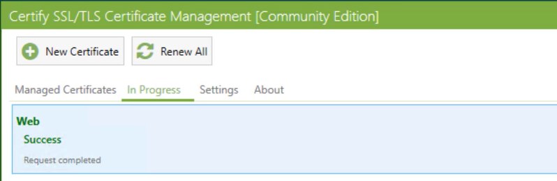 Dans l'onglet "In Progress", vous pouvez suivre le déroulement de la requête. Au bout de quelques secondes, vous devriez obtenir l'état "Success - Request completed" : à partir de là, votre site est doté d'un certificat SSL Let's Encrypt.