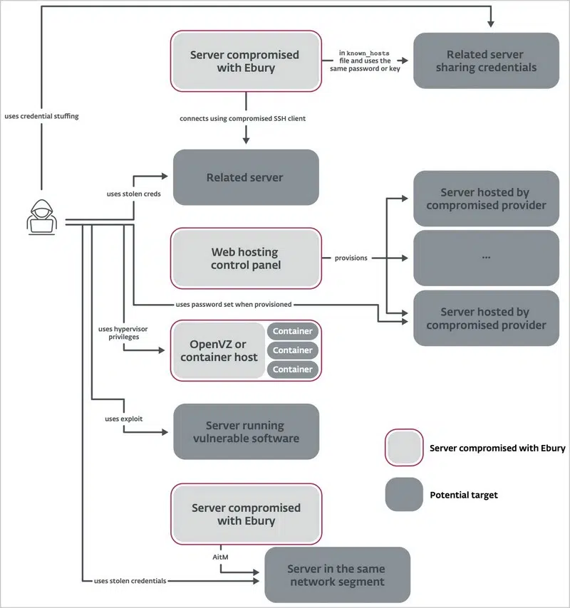 Les cyberattaques récentes d'Ebury montrent que les cybercriminels qui sont aux manettes cherchent à s'introduire sur l'infrastructure des fournisseurs de services Cloud et hébergeurs. Ainsi, ils peuvent prendre le contrôle des serveurs des clients de l'hébergeur dont l'infrastructure est compromise. Par exemple, il peut s'agir de serveurs VPS ou de containers.