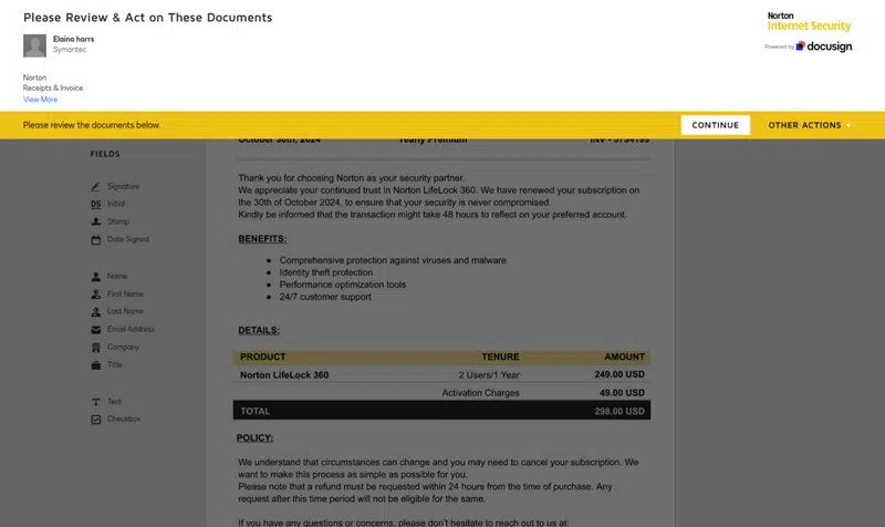 Grâce à cet accès, ils ont pu accéder à la fonction de création de modèles et ainsi usurper facilement l'identité d'autres marques. Par l'intermédiaire de l'API, ils sont parvenus à automatiser la création et l'envoi en masse de fausses factures. Lorsque l'utilisateur accède au document à signer, il arrive sur une page soignée, avec le logo de l'entreprise, ici Norton, et une facture avec un montant réaliste. Tout porte à croire que la facture est authentique, d'autant plus que la notification d'origine est envoyée par le service DocuSign.