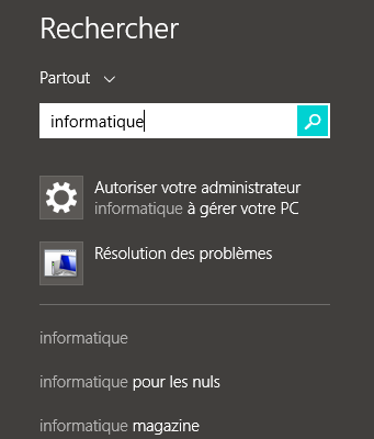 Depuis Windows 8, lorsque l'on effectue une recherche depuis la barre de recherche Metro, la recherche est effectuée au sein des données stockées sur l'ordinateur, mais également des suggestions de recherche via le moteur Bing apparaissent. Voyez par vous même de quoi je veux parler :