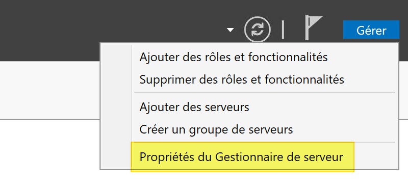 Pour commencer, voici pour rappel comment désactiver le démarrage automatique au sein d'une session, uniquement pour l'utilisateur en cours. Ouvrez le Gestionnaire de serveur, cliquez sur "Gérer" puis "Propriétés du Gestionnaire de serveur".