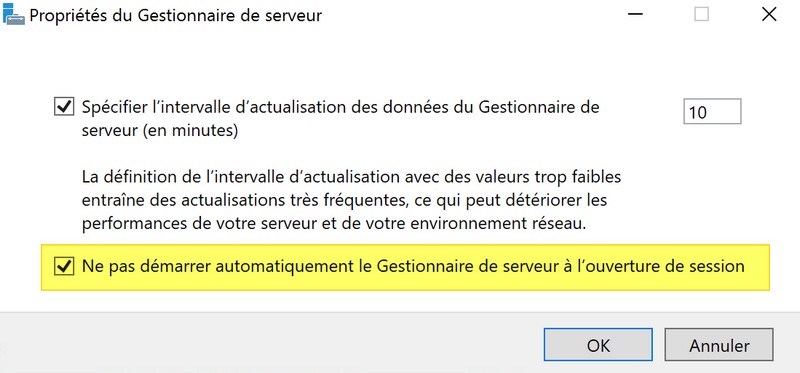 Une fenêtre va s'afficher : cochez l'option "Ne pas démarrer automatiquement le Gestionnaire de serveur à l'ouverture de session" et validez. Le tour est joué pour cette session, sur ce serveur.
