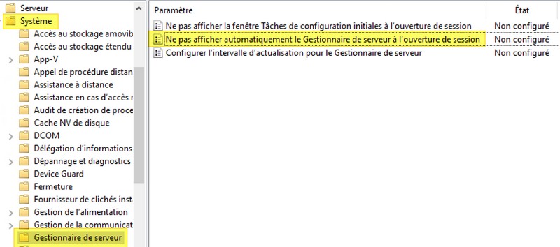 Sur une version anglais, le chemin est : Computer Configuration > Administrative Templates > System > Server Manager > Don't display Server Manamger automatically at Logon