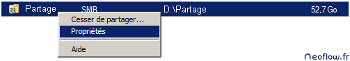 Ensuite, clic droit sur le répertoire partagé auquel on veut désactiver l’énumération, qui par défaut est active, puis Propriétés.
