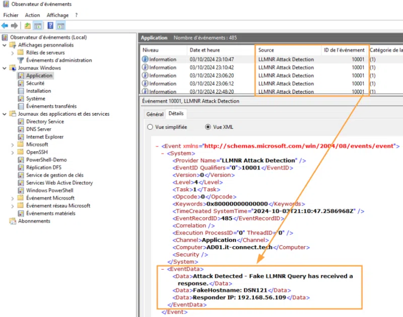 En fonction de la présence ou non d'une réponse à la requête LLMNR, nous allons journaliser la réponse obtenue (et surtout l'adresse IP de l'attaquant) dans le terminal ou les logs Windows. J'utilise pour les logs Windows la commande "Write-EventLogV2" présentée dans cet article :