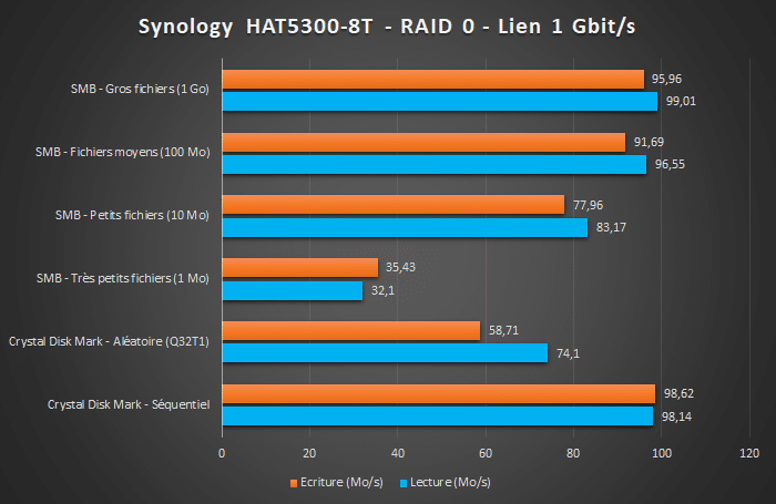 Pour réaliser les tests de performance, j'ai effectué des transferts de fichiers via SMB entre mon PC et le NAS, via une connexion réseau 1 Gbit/s. En complément, j'ai configuré un LUN (formaté en NTFS) sur le NAS que j'ai connecté sur Windows via iSCSI afin d'effectuer un benchmark avec le logiciel ATTO Disk Benchmark.
