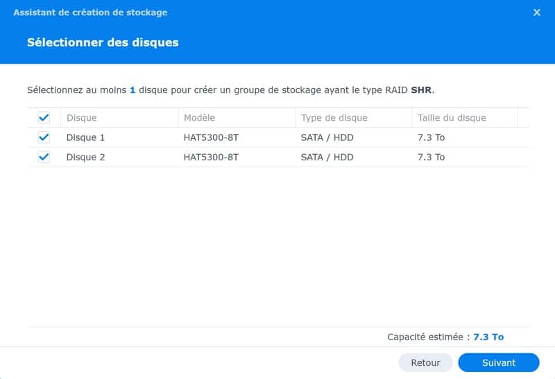 Pour évaluer les performances, j'ai configuré les deux disques avec un RAID de type "SHR", ce qui correspond au système de RAID fait maison de chez Synology. Le volume sera partitionné en "Btfrs".