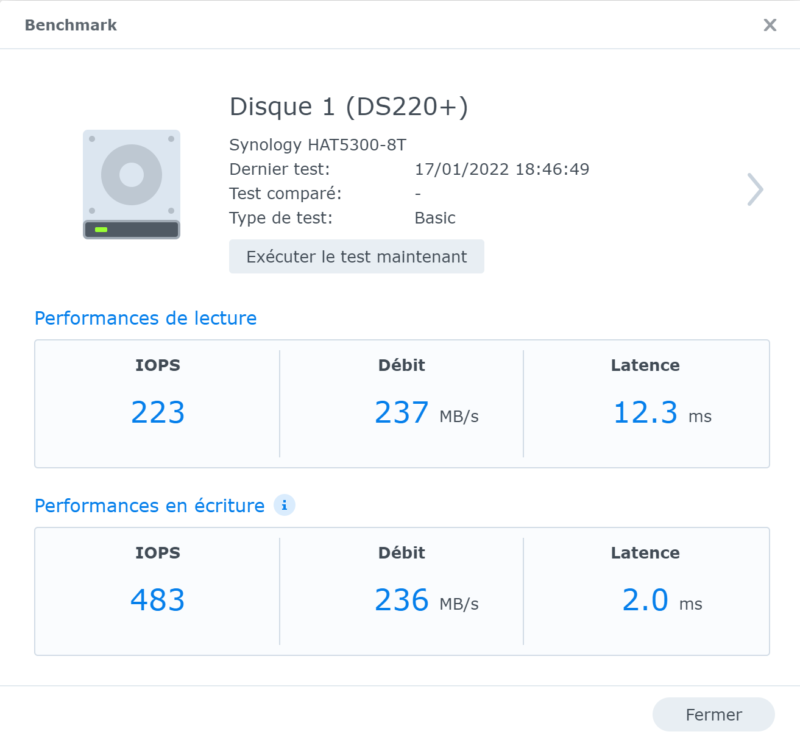Puisque DSM permet d'effectuer un Benchmark sur un disque dur (un seul disque à la fois), j'en ai profité pour réaliser ce test afin de vous donner des informations supplémentaires. Cela permet d'avoir un aperçu des performances pures, en local, sur un seul disque.