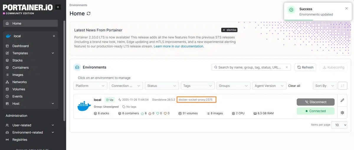 Portainer pourra ensuite se connecter à votre instance Docker par l'intermédiaire de notre proxy (en mode API).