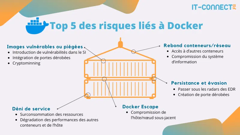 Lorsque l’on ne baigne pas quotidiennement dans la cybersécurité et que l’on n’a pas été spécifiquement formé à la technologie Docker, les risques concrets liés à celle-ci peuvent ne pas être clairement compris et intégrés. C’est pour cette raison que je vous présente dans cet article, les 5 principaux risques de sécurité liés à Docker. Nous évoquerons notamment les détails et impacts concrets de ces risques ainsi que les moyens de protection et bonnes pratiques associés.