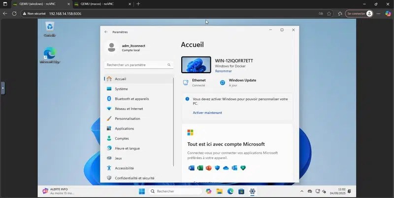 Puis accédez à votre conteneur, et donc à votre Windows, depuis votre navigateur : http://<adresse-IP-hôte-Docker>:8006. Par défaut, le conteneur ne disposera pas de sa propre adresse IP, mais si c'est votre souhait, sachez que c'est possible (créez un réseau macvlan).