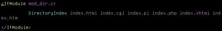 Dans Apache, on peut effectuer cette modification des documents par défaut dans la configuration du virtualhost ou du site en question (/etc/apache2/sites-enabled) ou alors dans un .htaccess si nous n'avons pas accès à la configuration du serveur web (dans le cas d'un hébergement mutualisé par exemple). Pour modifier cette information au niveau de tous les sites du serveur web, il faut se rendre dans le module qui gère ce paramétrage "/etc/apache2/mods-available/dir.conf" :