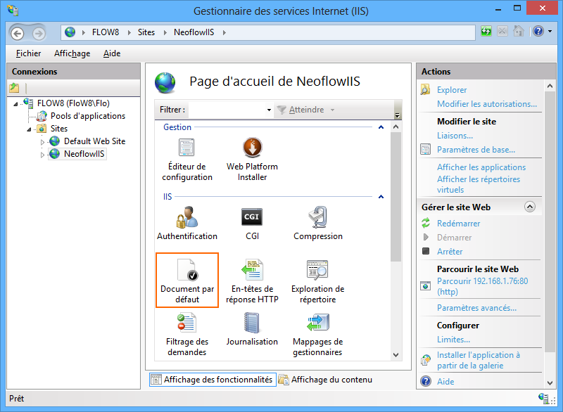 Accédez à la console de gestion d’IIS et positionnez sur le nom de votre serveur ou sur un de vos sites (sur l’objet où vous souhaitez appliquer la configuration en fait). Pour ma part, je vais configurer un site de test intitulé « NeoflowIIS ».