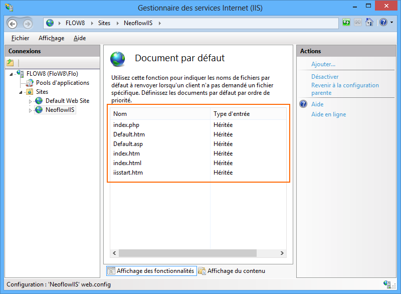 Si vous voulez que votre document par défaut se nomme « accueil.html » par exemple, vous voyez qu’il n’est pas dans la liste et donc ne sera pas pris en compte par IIS. De ce fait, il faut modifier la configuration d’IIS pour ajouter ce nom de document par défaut.