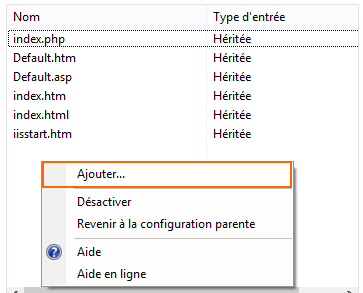 Vous obtiendrez une fenêtre semblable à celle indiquée ci-dessous. La colonne « Nom » indique tous les noms de fichiers que vous pouvez utiliser par défaut pour ce site web, si aucun fichier de votre site ne contient ce nom vous allez obtenir une erreur. La colonne « Type d’entrée » indique « Locale » lorsque le paramètre définit a été définit à partir de cet endroit, ou, « Héritée » lorsque le paramètre provient d’un objet parent c’est-à-dire qu’il a été définit sur le serveur directement alors il s’applique sur tous les objets enfants et donc tous les sites du serveur IIS.